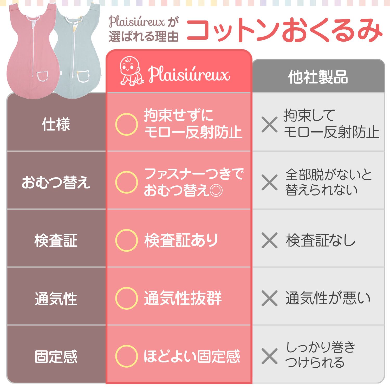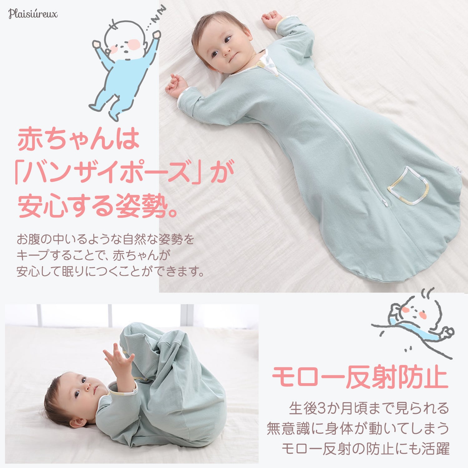 赤ちゃんは「バンザイポーズ」が安心する姿勢。従来の腕を固定してしまうおくるみではなく、お母さんのお腹の中いるような自然な姿勢をキープすることで、赤ちゃんが安心しぐっすり眠りにつくことができます。また、生後3か月頃までの赤ちゃんによく見られる、無意識に身体が動いてしまうモロー反射の防止にも活躍します。