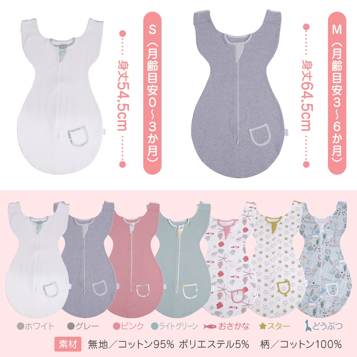 袖口から手を出せるタイプのおくるみ。握る、掴む、触るなどの手の動作が自由にできるので、活発に動きたい赤ちゃんに最適。おしゃぶりやおもちゃ遊びもできるので、ストレス発散にも◎ 袖口が開いていることで、通気性がよく、ムレ防止にもなります。<国際的な厳しい品質検査をクリアしています>
