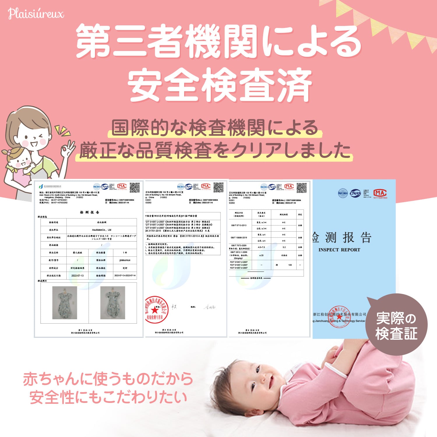 赤ちゃんにやさしいコットン素材を採用しました。通気性、吸水性がよくムレにくいので、暑い季節や汗をかきやすい赤ちゃんでも快適です。赤ちゃんの素肌に触れても安心ななめらかな肌触り。